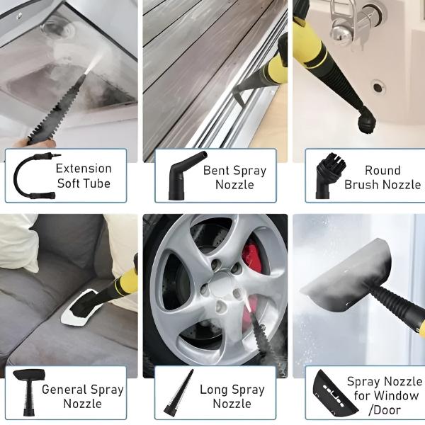 Uključuje četke, mlaznice i jastučiće za čišćenje podova, fuga, prozora i još mnogo toga.