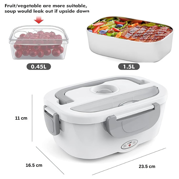 Ovaj spremnik za grijanje hrane sadrži dva uklonjiva spremnika kapaciteta 1,5 L i plastični spremnik od 0,45 L, koji se mogu koristiti naizmjenično.