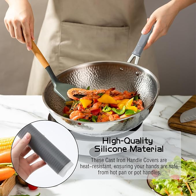 Naše silikonske navlake dizajnirane su da budu kompatibilne sa širokim rasponom veličina ručki za lonce i tave, što ih čini svestranim i prilagodljivim kuhinjskim dodacima, savršenim za tave od lijevanog željeza i tave s ravnim dnom.