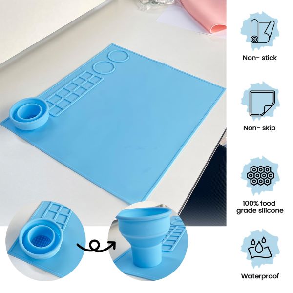 Napravljena od 100 % prehrambenog silikona, ova vodootporna, neljepljiva i neklizajuća prostirka savršena je za sve Vaše potrebe izrade. S 14 odjeljaka i prostorom za miješanje, savršena je za organiziranje Vaših zaliha.